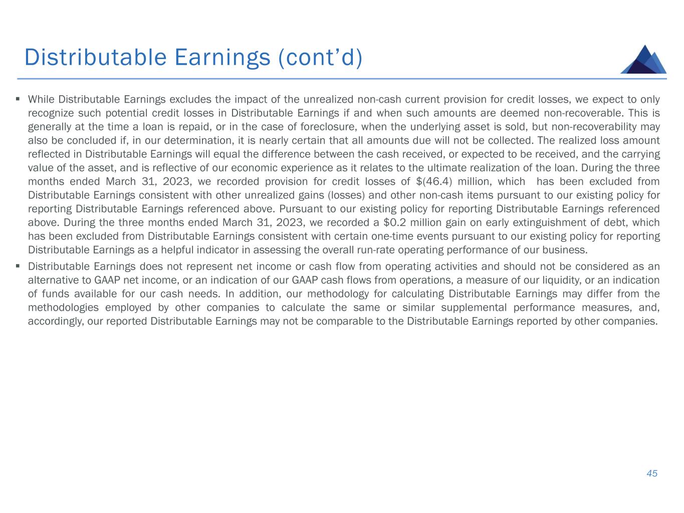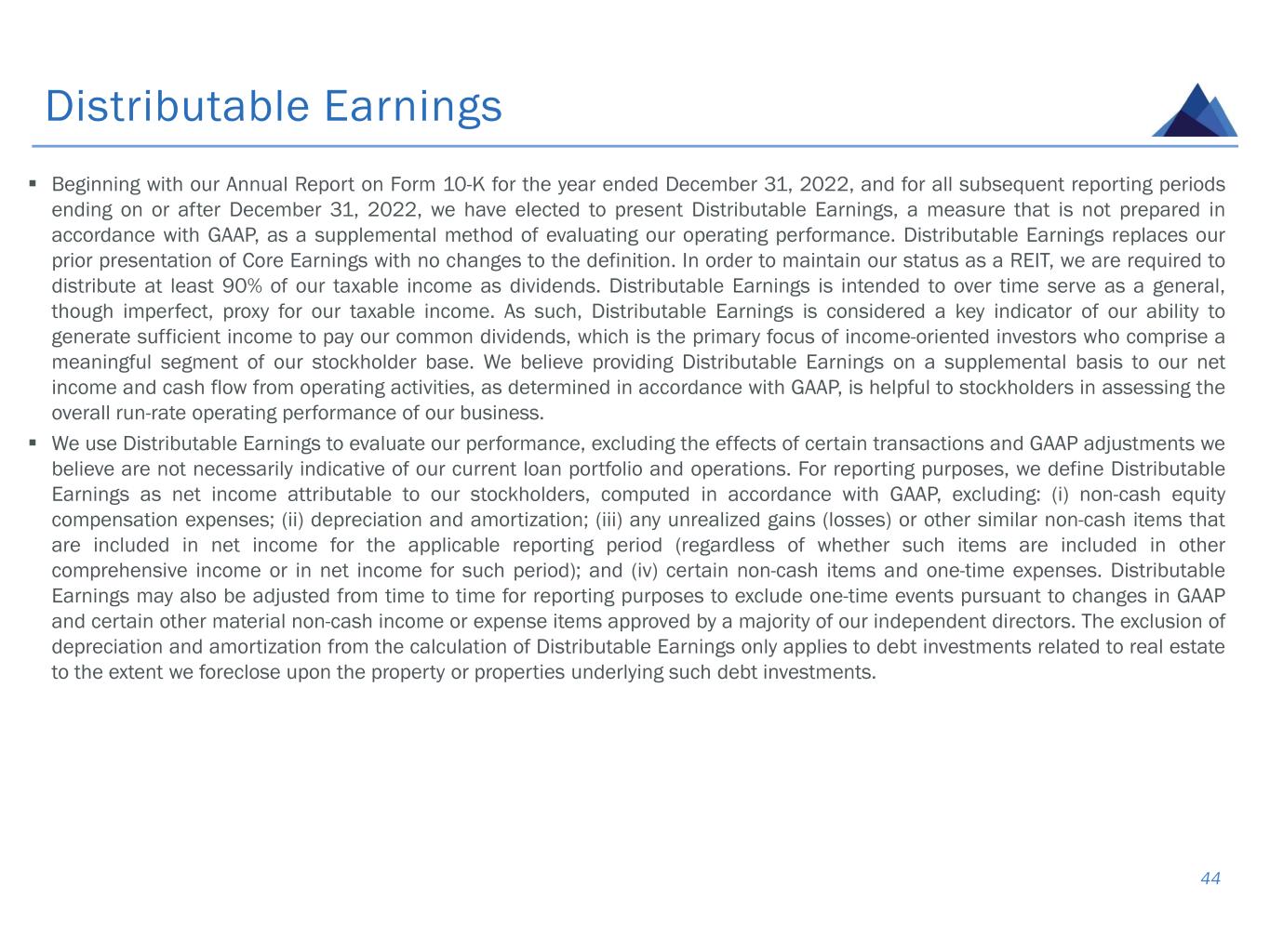 ▪ Beginning with our Annual Report on Form 10-K for the year ended December 31, 2022, and for all subsequent reporting periods ending on or after December 31, 2022, we have elected to present Distributable Earnings, a measure that is not prepared in accordance with GAAP, as a supplemental method of evaluating our operating performance. Distributable Earnings replaces our prior presentation of Core Earnings with no changes to the definition. In order to maintain our status as a REIT, we are required to distribute at least 90% of our taxable income as dividends. Distributable Earnings is intended to over time serve as a general, though imperfect, proxy for our taxable income. As such, Distributable Earnings is considered a key indicator of our ability to generate sufficient income to pay our common dividends, which is the primary focus of income-oriented investors who comprise a meaningful segment of our stockholder base. We believe providing Distributable Earnings on a supplemental basis to our net income and cash flow from operating activities, as determined in accordance with GAAP, is helpful to stockholders in assessing the overall run-rate operating performance of our business. ▪ We use Distributable Earnings to evaluate our performance, excluding the effects of certain transactions and GAAP adjustments we believe are not necessarily indicative of our current loan portfolio and operations. For reporting purposes, we define Distributable Earnings as net income attributable to our stockholders, computed in accordance with GAAP, excluding: (i) non-cash equity compensation expenses; (ii) depreciation and amortization; (iii) any unrealized gains (losses) or other similar non-cash items that are included in net income for the applicable reporting period (regardless of whether such items are included in other comprehensive income or in net income for such period); and (iv) certain non-cash items and one-time expenses. Distributable Earnings may also be adjusted from time to time for reporting purposes to exclude one-time events pursuant to changes in GAAP and certain other material non-cash income or expense items approved by a majority of our independent directors. The exclusion of depreciation and amortization from the calculation of Distributable Earnings only applies to debt investments related to real estate to the extent we foreclose upon the property or properties underlying such debt investments. Distributable Earnings 44