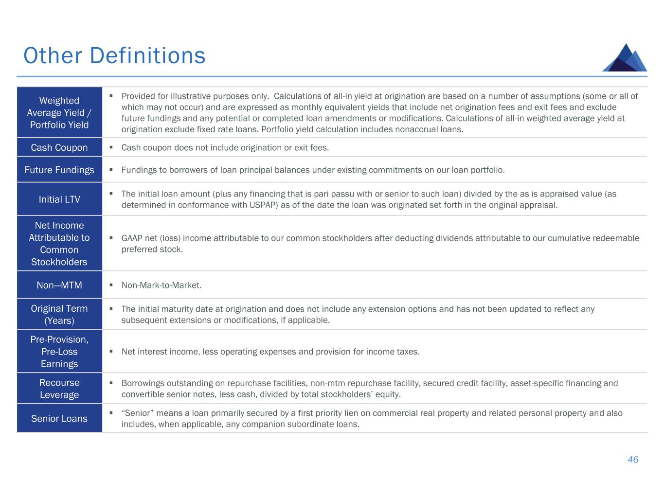 Other Definitions 46 Weighted Average Yield / Portfolio Yield ▪ Provided for illustrative purposes only. Calculations of all-in yield at origination are based on a number of assumptions (some or all of which may not occur) and are expressed as monthly equivalent yields that include net origination fees and exit fees and exclude future fundings and any potential or completed loan amendments or modifications. Calculations of all-in weighted average yield at origination exclude fixed rate loans. Portfolio yield calculation includes nonaccrual loans. Cash Coupon ▪ Cash coupon does not include origination or exit fees. Future Fundings ▪ Fundings to borrowers of loan principal balances under existing commitments on our loan portfolio. Initial LTV ▪ The initial loan amount (plus any financing that is pari passu with or senior to such loan) divided by the as is appraised value (as determined in conformance with USPAP) as of the date the loan was originated set forth in the original appraisal. Net Income Attributable to Common Stockholders ▪ GAAP net (loss) income attributable to our common stockholders after deducting dividends attributable to our cumulative redeemable preferred stock. Non—MTM ▪ Non-Mark-to-Market. Original Term (Years) ▪ The initial maturity date at origination and does not include any extension options and has not been updated to reflect any subsequent extensions or modifications, if applicable. Pre-Provision, Pre-Loss Earnings ▪ Net interest income, less operating expenses and provision for income taxes. Recourse Leverage ▪ Borrowings outstanding on repurchase facilities, non-mtm repurchase facility, secured credit facility, asset-specific financing and convertible senior notes, less cash, divided by total stockholders’ equity. Senior Loans ▪ “Senior” means a loan primarily secured by a first priority lien on commercial real property and related personal property and also includes, when applicable, any companion subordinate loans.