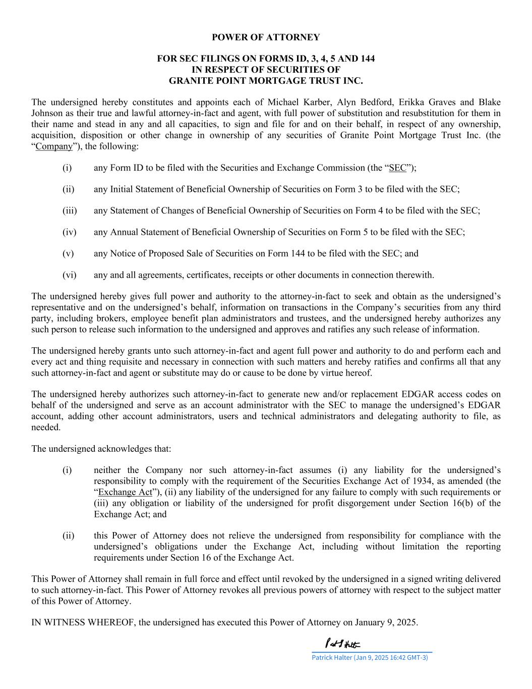 POWER OF ATTORNEY FOR SEC FILINGS ON FORMS ID, 3, 4, 5 AND 144 IN RESPECT OF SECURITIES OF GRANITE POINT MORTGAGE TRUST INC. The undersigned hereby constitutes and appoints each of Michael Karber, Alyn Bedford, Erikka Graves and Blake Johnson as their true and lawful attorney-in-fact and agent, with full power of substitution and resubstitution for them in their name and stead in any and all capacities, to sign and file for and on their behalf, in respect of any ownership, acquisition, disposition or other change in ownership of any securities of Granite Point Mortgage Trust Inc. (the “Company”), the following: (i) any Form ID to be filed with the Securities and Exchange Commission (the “SEC”); (ii) any Initial Statement of Beneficial Ownership of Securities on Form 3 to be filed with the SEC; (iii) any Statement of Changes of Beneficial Ownership of Securities on Form 4 to be filed with the SEC; (iv) any Annual Statement of Beneficial Ownership of Securities on Form 5 to be filed with the SEC; (v) any Notice of Proposed Sale of Securities on Form 144 to be filed with the SEC; and (vi) any and all agreements, certificates, receipts or other documents in connection therewith. The undersigned hereby gives full power and authority to the attorney-in-fact to seek and obtain as the undersigned’s representative and on the undersigned’s behalf, information on transactions in the Company’s securities from any third party, including brokers, employee benefit plan administrators and trustees, and the undersigned hereby authorizes any such person to release such information to the undersigned and approves and ratifies any such release of information. The undersigned hereby grants unto such attorney-in-fact and agent full power and authority to do and perform each and every act and thing requisite and necessary in connection with such matters and hereby ratifies and confirms all that any such attorney-in-fact and agent or substitute may do or cause to be done by virtue hereof. The undersigned hereby authorizes such attorney-in-fact to generate new and/or replacement EDGAR access codes on behalf of the undersigned and serve as an account administrator with the SEC to manage the undersigned’s EDGAR account, adding other account administrators, users and technical administrators and delegating authority to file, as needed. The undersigned acknowledges that: (i) neither the Company nor such attorney-in-fact assumes (i) any liability for the undersigned’s responsibility to comply with the requirement of the Securities Exchange Act of 1934, as amended (the “Exchange Act”), (ii) any liability of the undersigned for any failure to comply with such requirements or (iii) any obligation or liability of the undersigned for profit disgorgement under Section 16(b) of the Exchange Act; and (ii) this Power of Attorney does not relieve the undersigned from responsibility for compliance with the undersigned’s obligations under the Exchange Act, including without limitation the reporting requirements under Section 16 of the Exchange Act. This Power of Attorney shall remain in full force and effect until revoked by the undersigned in a signed writing delivered to such attorney-in-fact. This Power of Attorney revokes all previous powers of attorney with respect to the subject matter of this Power of Attorney. IN WITNESS WHEREOF, the undersigned has executed this Power of Attorney on January 9, 2025. Patrick Halter (Jan 9, 2025 16:42 GMT-3)