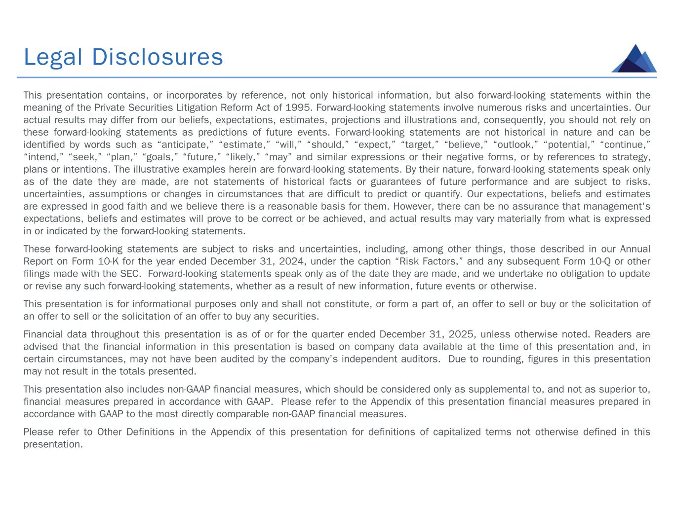 Legal Disclosures This presentation contains, or incorporates by reference, not only historical information, but also forward-looking statements within the meaning of the Private Securities Litigation Reform Act of 1995. Forward-looking statements involve numerous risks and uncertainties. Our actual results may differ from our beliefs, expectations, estimates, projections and illustrations and, consequently, you should not rely on these forward-looking statements as predictions of future events. Forward-looking statements are not historical in nature and can be identified by words such as “anticipate,” “estimate,” “will,” “should,” “expect,” “target,” “believe,” “outlook,” “potential,” “continue,” “intend,” “seek,” “plan,” “goals,” “future,” “likely,” “may” and similar expressions or their negative forms, or by references to strategy, plans or intentions. The illustrative examples herein are forward-looking statements. By their nature, forward-looking statements speak only as of the date they are made, are not statements of historical facts or guarantees of future performance and are subject to risks, uncertainties, assumptions or changes in circumstances that are difficult to predict or quantify. Our expectations, beliefs and estimates are expressed in good faith and we believe there is a reasonable basis for them. However, there can be no assurance that management's expectations, beliefs and estimates will prove to be correct or be achieved, and actual results may vary materially from what is expressed in or indicated by the forward-looking statements. These forward-looking statements are subject to risks and uncertainties, including, among other things, those described in our Annual Report on Form 10-K for the year ended December 31, 2024, under the caption “Risk Factors,” and any subsequent Form 10-Q or other filings made with the SEC. Forward-looking statements speak only as of the date they are made, and we undertake no obligation to update or revise any such forward-looking statements, whether as a result of new information, future events or otherwise. This presentation is for informational purposes only and shall not constitute, or form a part of, an offer to sell or buy or the solicitation of an offer to sell or the solicitation of an offer to buy any securities. Financial data throughout this presentation is as of or for the quarter ended December 31, 2025, unless otherwise noted. Readers are advised that the financial information in this presentation is based on company data available at the time of this presentation and, in certain circumstances, may not have been audited by the company’s independent auditors. Due to rounding, figures in this presentation may not result in the totals presented. This presentation also includes non-GAAP financial measures, which should be considered only as supplemental to, and not as superior to, financial measures prepared in accordance with GAAP. Please refer to the Appendix of this presentation financial measures prepared in accordance with GAAP to the most directly comparable non-GAAP financial measures. Please refer to Other Definitions in the Appendix of this presentation for definitions of capitalized terms not otherwise defined in this presentation.