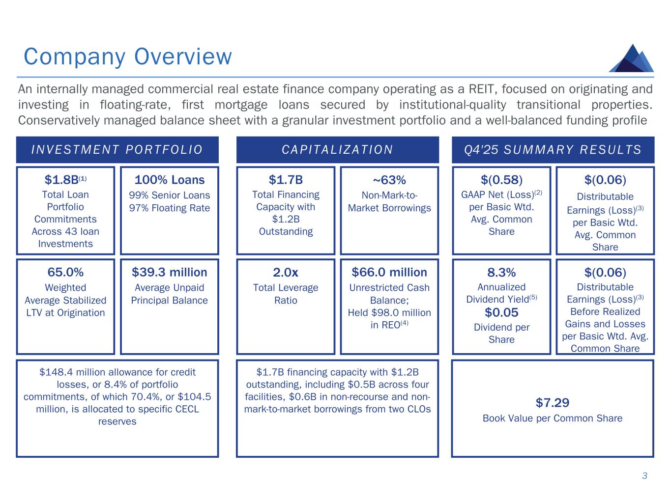 $(0.06) Distributable Earnings (Loss)(3) Before Realized Gains and Losses per Basic Wtd. Avg. Common Share Q4'25 SUMMARY RESULTSINVESTMENT PORTFOL IO 3 $1.8B(1) Total Loan Portfolio Commitments Across 43 loan Investments 100% Loans 99% Senior Loans 97% Floating Rate 65.0% Weighted Average Stabilized LTV at Origination ~63% Non-Mark-to- Market Borrowings 2.0x Total Leverage Ratio $1.7B Total Financing Capacity with $1.2B Outstanding $66.0 million Unrestricted Cash Balance; Held $98.0 million in REO(4) $39.3 million Average Unpaid Principal Balance Company Overview CAP ITAL IZAT ION $(0.06) Distributable Earnings (Loss)(3) per Basic Wtd. Avg. Common Share 8.3% Annualized Dividend Yield(5) $0.05 Dividend per Share $(0.58) GAAP Net (Loss)(2) per Basic Wtd. Avg. Common Share $148.4 million allowance for credit losses, or 8.4% of portfolio commitments, of which 70.4%, or $104.5 million, is allocated to specific CECL reserves $1.7B financing capacity with $1.2B outstanding, including $0.5B across four facilities, $0.6B in non-recourse and non- mark-to-market borrowings from two CLOs $7.29 Book Value per Common Share An internally managed commercial real estate finance company operating as a REIT, focused on originating and investing in floating-rate, first mortgage loans secured by institutional-quality transitional properties. Conservatively managed balance sheet with a granular investment portfolio and a well-balanced funding profile