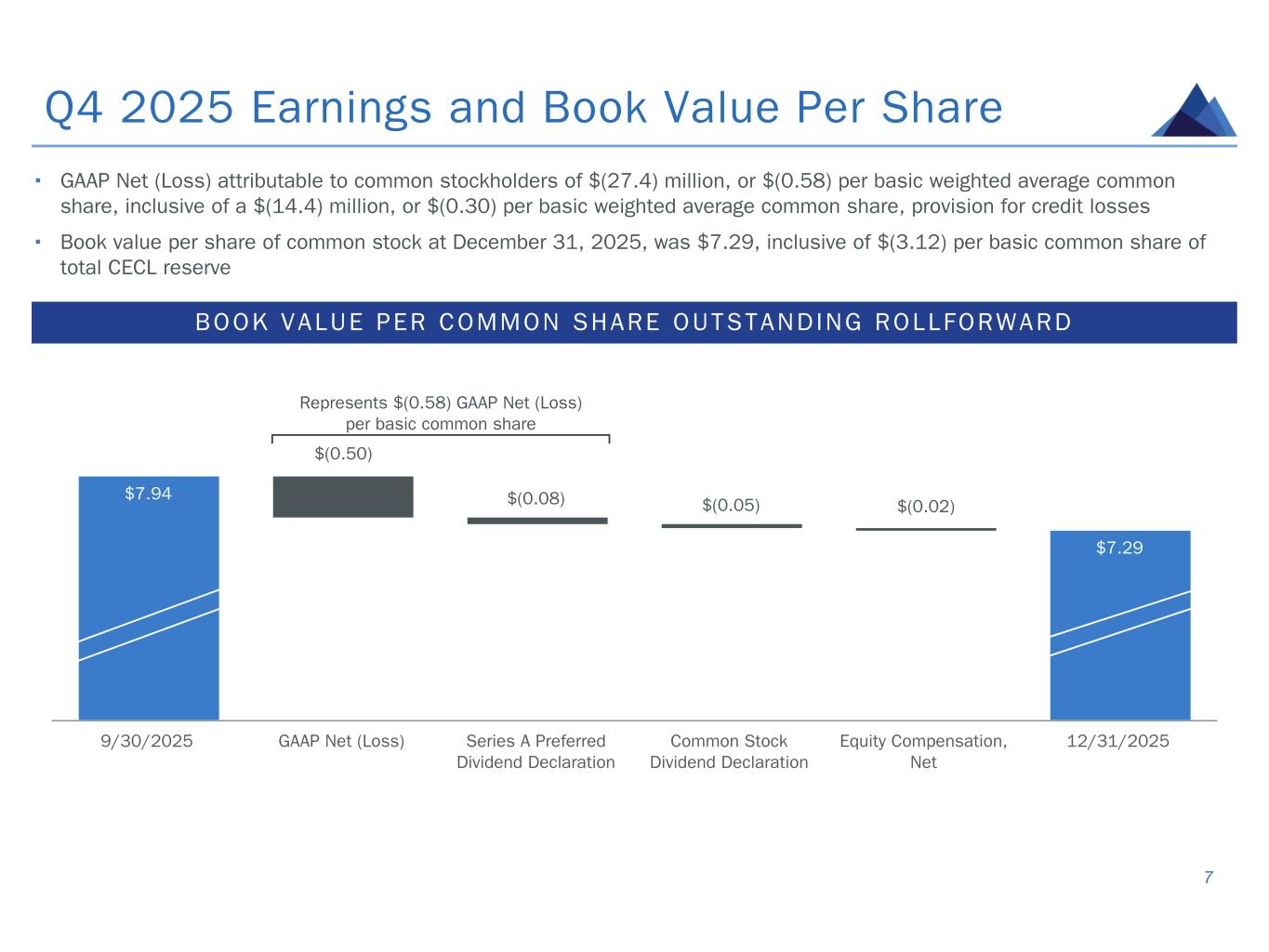 Summary Income Statement ($ in millions, except per share data) (Unaudited) Net Interest Income $7.5 (Provision for) Benefit from Credit Losses $(14.4) Revenue / (Expenses) from Real Estate Owned Operations, net $(2.5) Impairment Loss on Real Estate Owned $(6.8) Operating Expenses $(7.6) Dividends on Preferred Stock $(3.6) GAAP Net (loss) attributable to common stockholders $(27.4) Net (loss) Per Basic Wtd. Avg. Common Share $(0.58) Net (loss) Per Diluted Wtd. Avg. Common Share $(0.58) Common Dividend Per Share $0.05 Series A Preferred Dividend Per Share $0.4375 Basic Wtd. Avg. Common Shares 47,406,719 Diluted Wtd. Avg. Common Shares 47,406,719 Q4 2025 Financial Summary 6 Summary Balance Sheet ($ in millions, except per share data, reflects carrying values) (Unaudited) Cash $66.0 Restricted Cash $14.1 Loans Held-for-Investment, net $1,537.7 Real Estate Owned, net(4) $98.0 Repurchase Facilities $439.2 Securitized (CLO) Debt $643.5 Secured Credit Facility $71.8 Mortgage Loan Payable $17.5 Preferred Equity $205.7 Common Equity $347.0 Total Stockholders’ Equity $552.7 Common Shares Outstanding 47,563,643 Book Value Per Common Share $7.29