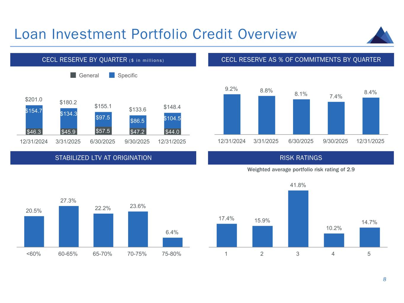 $7.44 $7.36 $7.31 $7.29 $7.94 $7.29 9/30/2025 GAAP Net (Loss) Series A Preferred Dividend Declaration Common Stock Dividend Declaration Equity Compensation, Net 12/31/2025 Q4 2025 Earnings and Book Value Per Share ▪ GAAP Net (Loss) attributable to common stockholders of $(27.4) million, or $(0.58) per basic weighted average common share, inclusive of a $(14.4) million, or $(0.30) per basic weighted average common share, provision for credit losses ▪ Book value per share of common stock at December 31, 2025, was $7.29, inclusive of $(3.12) per basic common share of total CECL reserve 7 BOOK VALUE PER COMMON SHARE OUTSTANDING ROLLFORWARD Represents $(0.58) GAAP Net (Loss) per basic common share $(0.50) $(0.08) $(0.05) $(0.02)