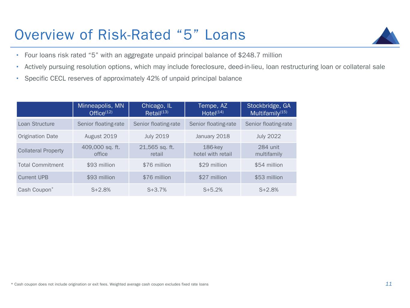 Loan Investment Portfolio Overview 10 Well-diversified and granular portfolio comprised of over 99% senior loans with a weighted average stabilized LTV at origination of 65.0% Total Loan Commitments $1.8 billion Unpaid Principal Balance $1.7 billion Number of Loans 43 Average UPB ~ $39.3 million Realized Loan Portfolio Yield(8) 6.7% Weighted Average Stabilized LTV at Origination 65.0% Weighted Average Fully-Extended Remaining Term(9) 1.0 years KEY LOAN PORTFOLIO STATISTICS PROPERTY TYPE(10)(11) REGION(11) Office, 43.6% Multifamily, 31.3% Retail, 8.2% Industrial, 7.4% Hotel, 6.9% Other, 2.6% Northeast, 25.0% Southwest, 21.5% Southeast, 21.4% Midwest, 16.9% West, 15.2%