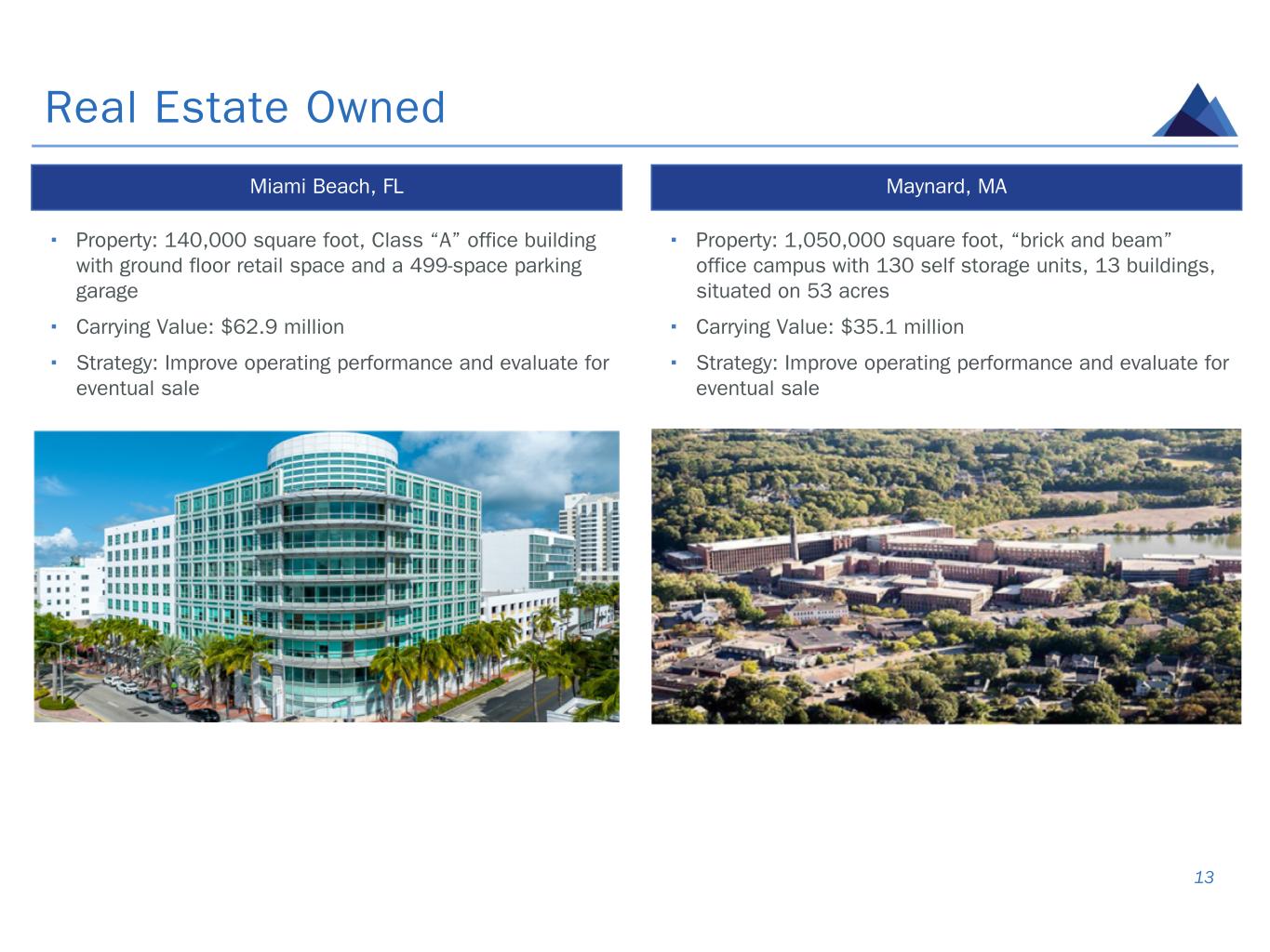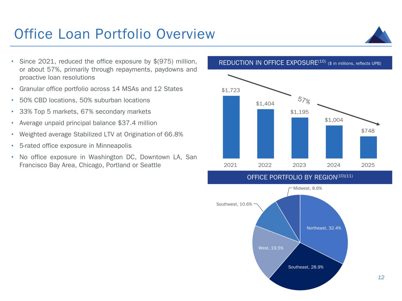 $1,723 $1,404 $1,195 $1,004 $748 2021 2022 2023 2024 2025 Office Loan Portfolio Overview 12 ▪ Since 2021, reduced the office exposure by $(975) million, or about 57%, primarily through repayments, paydowns and proactive loan resolutions ▪ Granular office portfolio across 14 MSAs and 12 States ▪ 50% CBD locations, 50% suburban locations ▪ 33% Top 5 markets, 67% secondary markets ▪ Average unpaid principal balance $37.4 million ▪ Weighted average Stabilized LTV at Origination of 66.8% ▪ 5-rated office exposure in Minneapolis ▪ No office exposure in Washington DC, Downtown LA, San Francisco Bay Area, Chicago, Portland or Seattle OFFICE PORTFOLIO BY REGION(10)(11) REDUCTION IN OFFICE EXPOSURE(10) ($ in millions, reflects UPB) 57% Northeast, 32.4% Southeast, 28.9% West, 19.5% Southwest, 10.6% Midwest, 8.6%