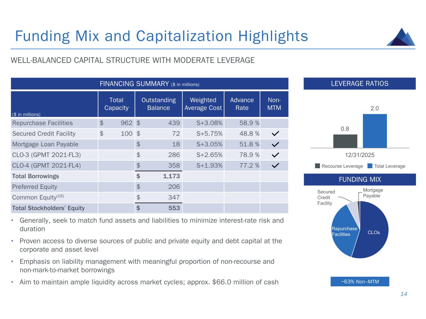FINANCING SUMMARY ($ in millions) ($ in millions) Total Capacity Outstanding Balance Weighted Average Cost Advance Rate Non- MTM Repurchase Facilities $ 962 $ 439 S+3.08% 58.9 % Secured Credit Facility $ 100 $ 72 S+5.75% 48.8 % Mortgage Loan Payable $ 18 S+3.05% 51.8 % CLO-3 (GPMT 2021-FL3) $ 286 S+2.65% 78.9 % CLO-4 (GPMT 2021-FL4) $ 358 S+1.93% 77.2 % Total Borrowings $ 1,173 Preferred Equity $ 206 Common Equity(16) $ 347 Total Stockholders’ Equity $ 553 Funding Mix and Capitalization Highlights 14 FUNDING MIX WELL-BALANCED CAPITAL STRUCTURE WITH MODERATE LEVERAGE LEVERAGE RATIOS ~63% Non–MTM 0.8 2.0 Recourse Leverage Total Leverage 12/31/2025 CLOs Repurchase Facilities Secured Credit Facility Mortgage Payable ▪ Generally, seek to match fund assets and liabilities to minimize interest-rate risk and duration ▪ Proven access to diverse sources of public and private equity and debt capital at the corporate and asset level ▪ Emphasis on liability management with meaningful proportion of non-recourse and non-mark-to-market borrowings ▪ Aim to maintain ample liquidity across market cycles; approx. $66.0 million of cash