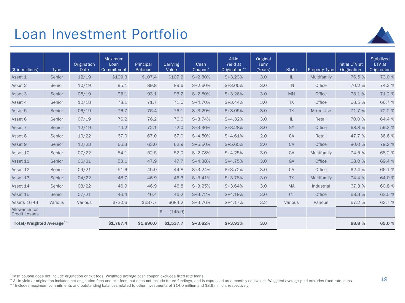 * Cash coupon does not include origination or exit fees. Weighted average cash coupon excludes fixed rate loans ** All-in yield at origination includes net origination fees and exit fees, but does not include future fundings, and is expressed as a monthly equivalent. Weighted average yield excludes fixed rate loans *** Includes maximum commitments and outstanding balances related to other investments of $14.0 million and $8.9 million, respectively Summary of Investment Portfolio 18 ($ in millions) Maximum Loan Commitment Principal Balance Carrying Value Cash Coupon* All-in Yield at Origination** Original Term (Years) Initial LTV at Origination Stabilized LTV at Origination Senior Loans*** $1,754.4 $1,677.0 $1,524.8 S+3.62% S+3.93% 3.0 69.0% 65.2% Subordinated Loans $13.0 $13.0 $12.9 8.00% 8.11% 10.0 41.4% 36.2% Total Weighted/Average $1,767.4 $1,690.0 $1,537.7 S+3.62% S+3.93% 3.0 68.8% 65.0%