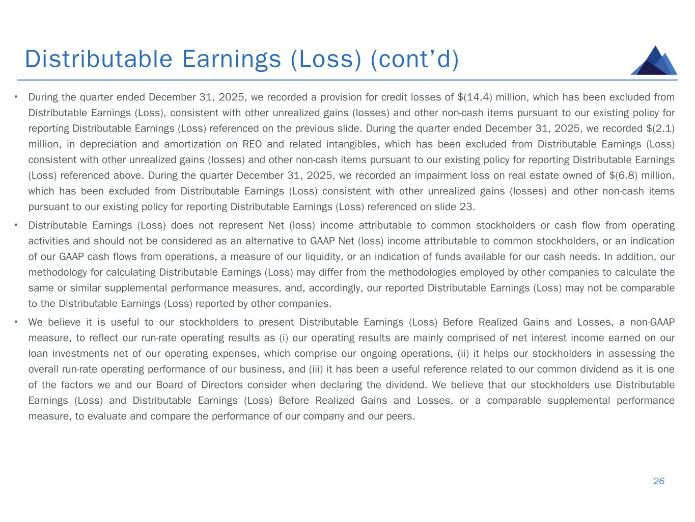 ▪ Beginning with our Annual Report on Form 10-K for the year ended December 31, 2024, and for all subsequent reporting periods ending on or after December 31, 2024, we have elected to present Distributable Earnings (Loss), a non-GAAP measure, as a supplemental method of evaluating our operating performance. In order to maintain our status as a REIT, we are required to distribute at least 90% of our taxable income to stockholders, subject to certain distribution requirements. Distributable Earnings (Loss) is intended to over time serve as a general, though imperfect, proxy for our taxable income. As such, Distributable Earnings (Loss) is considered a key indicator of our ability to generate sufficient income to pay dividends on our common stock, which is the primary focus of income-oriented investors who comprise a meaningful segment of our stockholder base. We believe providing Distributable Earnings (Loss) on a supplemental basis to our net income (loss) and cash flow from operating activities, as determined in accordance with GAAP, is helpful to stockholders in assessing the overall operating performance of our business. ▪ For reporting purposes, we define Distributable Earnings (Loss) as net income (loss) attributable to our stockholders, computed in accordance with GAAP, excluding: (i) non-cash equity compensation expenses; (ii) depreciation and amortization; (iii) any unrealized gains (losses) or other similar non-cash items that are included in net income (loss) for the applicable reporting period (regardless of whether such items are included in other comprehensive income or in net income (loss) for such period); and (iv) certain non-cash items and one- time expenses. Distributable Earnings (Loss) may also be adjusted from time to time for reporting purposes to exclude one-time events pursuant to changes in GAAP and certain other material non-cash income or expense items approved by a majority of our independent directors. The exclusion of depreciation and amortization from the calculation of Distributable Earnings (Loss) only applies to debt investments related to real estate to the extent we foreclose upon the property or properties underlying such debt investments. ▪ While Distributable Earnings (Loss) excludes the impact of the unrealized non-cash current provision for credit losses, we expect to only recognize such potential credit losses in Distributable Earnings (Loss) if and when such amounts are deemed non-recoverable. This is generally at the time a loan is repaid, or in the case of foreclosure, when the underlying asset is sold, but non-recoverability may also be concluded if, in our determination, it is nearly certain that all amounts due will not be collected. The realized loss amount reflected in Distributable Earnings (Loss) will equal the difference between the cash received, or expected to be received, and the carrying value of the asset, and is reflective of our economic experience as it relates to the ultimate realization of the loan. Distributable Earnings (Loss) 25