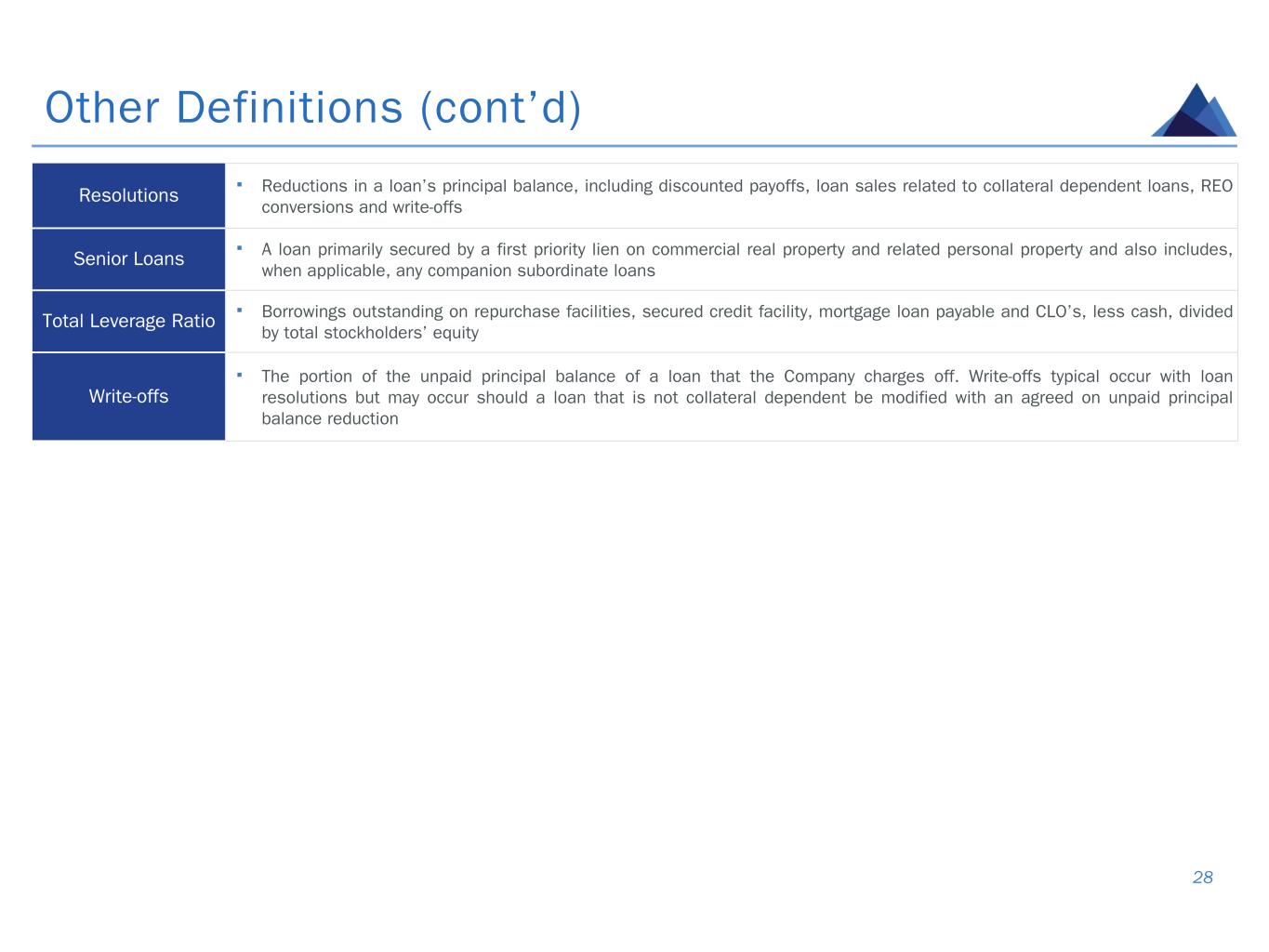 Other Definitions 27 Realized Loan Portfolio Yield ▪ Provided for illustrative purposes only. Calculations of realized loan portfolio yield are based on a number of assumptions (some or all of which may not occur) and are expressed as monthly equivalent yields that include net origination fees and exit fees and exclude future fundings and any potential or completed loan amendments or modifications Fundings ▪ Increases in a loan’s principal balance, including new originations, fundings on loan commitments, upsizings, capitalized deferred interest, paid-in-kind (PIK) interest and short-sales with loan assumptions Net (loss) Attributable to Common Stockholders ▪ GAAP net (loss) attributable to our common stockholders after deducting dividends attributable to our cumulative redeemable preferred stock Initial LTV at Origination ▪ The initial loan amount (plus any financing that is pari passu with or senior to such loan) divided by the as is appraised value (as determined in conformance with USPAP) as of the date the loan was originated set forth in the original appraisal Stabilized LTV at Origination ▪ The fully funded loan amount (plus any financing that is pari passu with or senior to such loan), including all contractually provided for future fundings, divided by the as stabilized value (as determined in conformance with USPAP) set forth in the original appraisal. As stabilized value may be based on certain assumptions, such as future construction completion, projected re-tenanting, payment of tenant improvement or leasing commissions allowances or free or abated rent periods, or increased tenant occupancies Non-MTM ▪ Non-mark-to-market Original Term (Years) ▪ The term of the loan through the initial maturity date at origination. Does not include any extension options and has not been updated to reflect any subsequent extensions or modifications, if applicable Recourse Leverage Ratio ▪ Borrowings outstanding on repurchase facilities and secured credit facility, less cash, divided by total stockholders’ equity REO ▪ Real estate owned Repayments ▪ Reductions in a loan’s principal balance, including full loan repayments, partial loan repayments, principal amortization, cost- recovery for non-accrual loans and capitalized deferred interest repayments